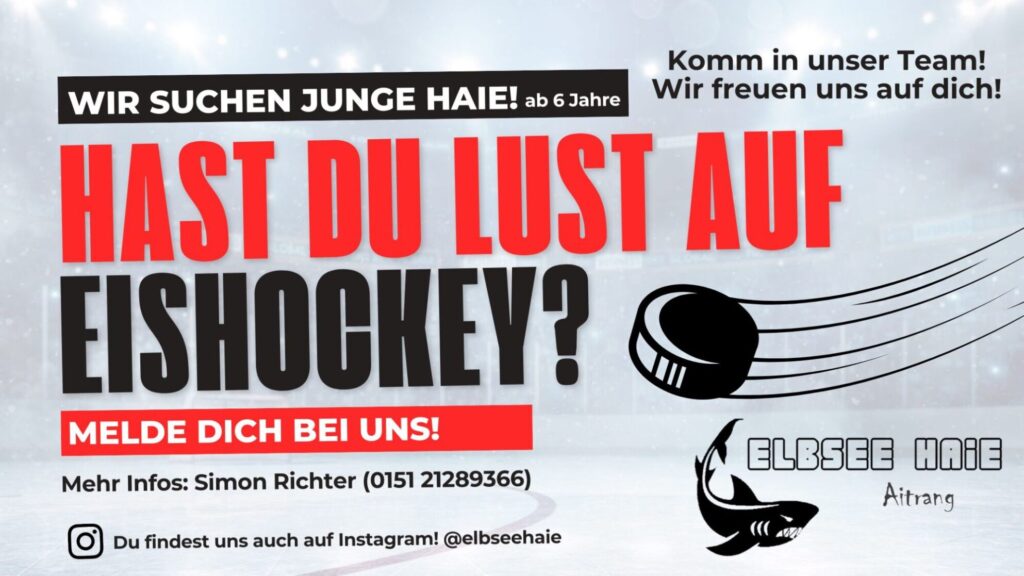 Du hast auch Lust auf Eishockey? Wir suchen Nachwuchs ab 6 Jahren! Egal ob Anfänger oder mit Erfahrung – komm vorbei und werde Teil der Haie. Für weitere Infos melde mich bei uns!